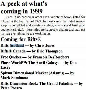 This was announced in 1999 along with Grand Paladins in Rifter 4. Was to be written by Chris Jones.